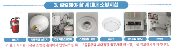 - 점검 대상: 모든 세대 내 소방시설(소화기, 화재감지기 등)이 포함되며, 아파트 구조에 따라 설치된 설비가 다를 수 있습니다.