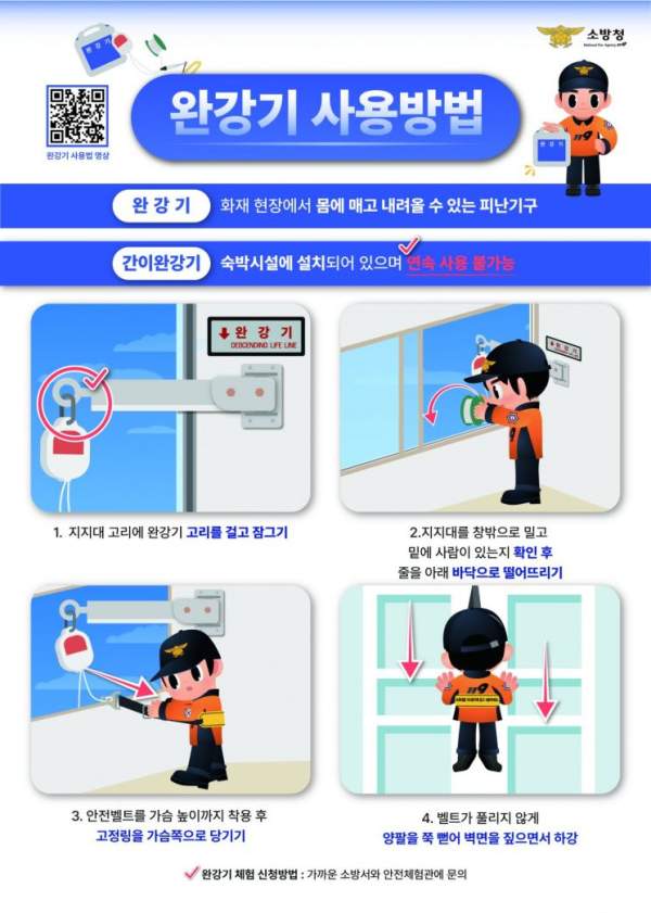 - 완강기: 완강기의 외형 상태와 설치 위치가 적절한지 확인합니다. 또한, 로프가 팽팽한 상태를 유지하는지 테스트하는 것이 중요합니다.