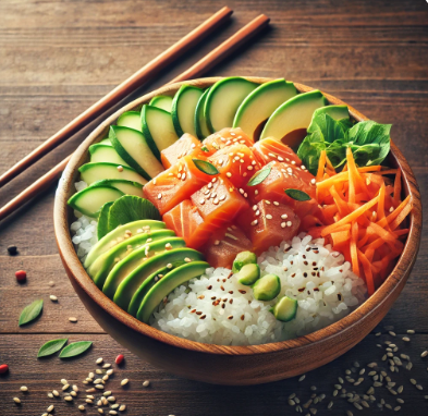 - 밥을 준비하고 그 위에 연어와 아보카도, 채소를 보기 좋게 올립니다.