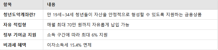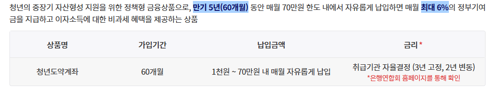 청년도약계좌는 청년들이 목돈을 마련하고 안정적인 자산 형성을 원하는 청년들에게 매우 유용한 금융상품입니다. 자격 요건을 충족한다면, 미래를 준비해보세요