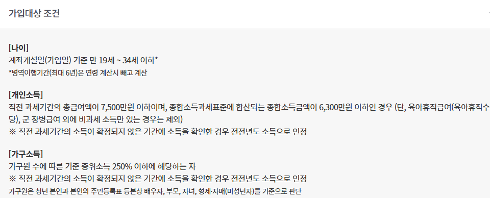 가입일 기준 만 19세~34세 사이이며, 병역 이행 기간이 증명될 경우 만 40세까지 가입 가능합니다. - 개인 소득 요건