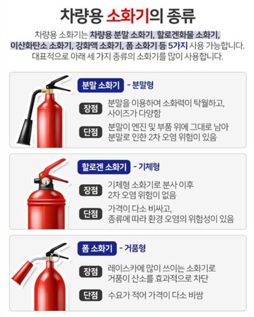 차량에 적합한 소화기를 선택하고 올바르게 비치해야 긴급 상황에서 제대로 대처할 수 있습니다. 🚗🔥