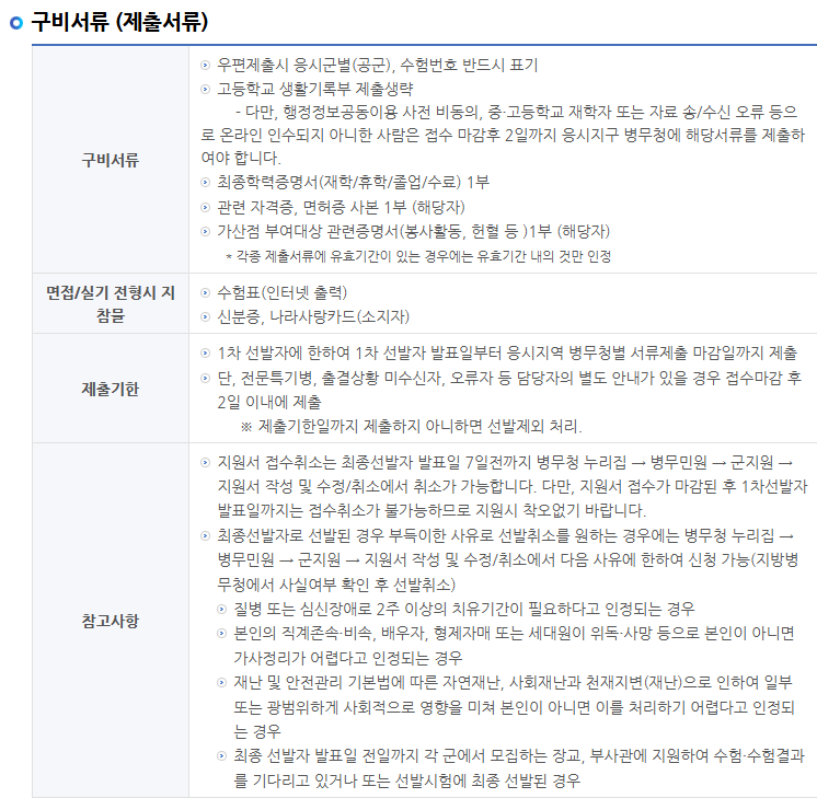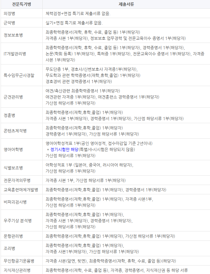 특정 직종에 지원하려면 추가 서류가 필요합니다. 예를 들어, 군악병은 학력증명서와 경력증명서를 제출해야 하며, 어학병은 어학성적표를 요구합니다. 지원 직종에 맞는 서류를 미리 준비하는 것이 중요합니다.
