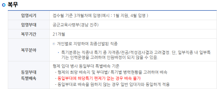 - 입영 장소: 모든 지원자는 경남 진주에 위치한 공군 교육사령부로 입영하며, 복무 기간은 총 21개월입니다.