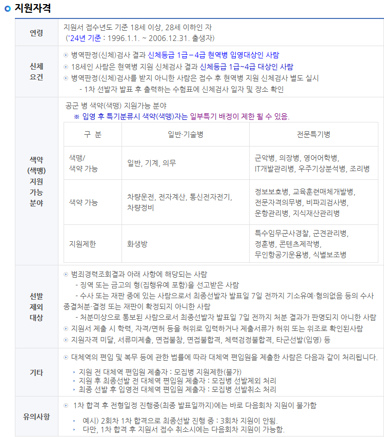 병역판정검사에서 신체등급 1급에서 4급을 받은 자만 지원할 수 있습니다. 아직 검사를 받지 않은 지원자는 접수 후 지정된 날짜에 신체검사를 받아야 합니다.